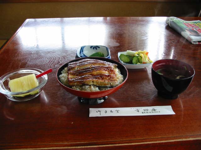 大仏から出た後、今度は牛久沼に向けて出発した。うなぎが有名のようで、沼周辺にお店が軒を連ねている。その中で、僕は、寺田屋という店に入りうな丼を注文した。汚い格好をしてたんで、店のおばちゃんが、「歩いてらっしゃるんですか?」俺「自転車です。」「どちらから・・」「どのくらいの期間で・・」な感じで話していたら、うなぎが来た!